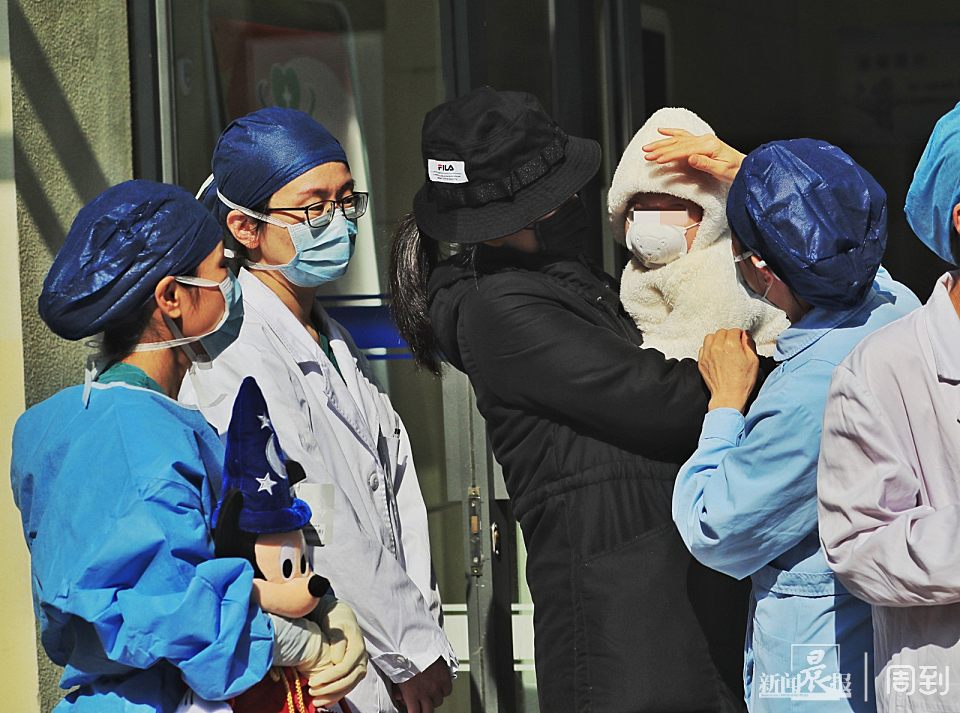 上午10点多,儿科医院医生护士陪着齐齐妈妈,抱着小宝宝走出住院大楼。