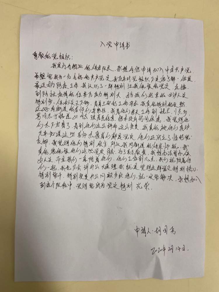 每天15个小时驻守出入口并不是工作的全部,居家健康观察居民缺少应急用药,他们需要做代购员;居民们出现的情绪波动,他们需要当心理辅导员……这一切,方舟商办楼保安胡国兵都看在眼里,于是便有了开头递交入党申请书的那一幕。