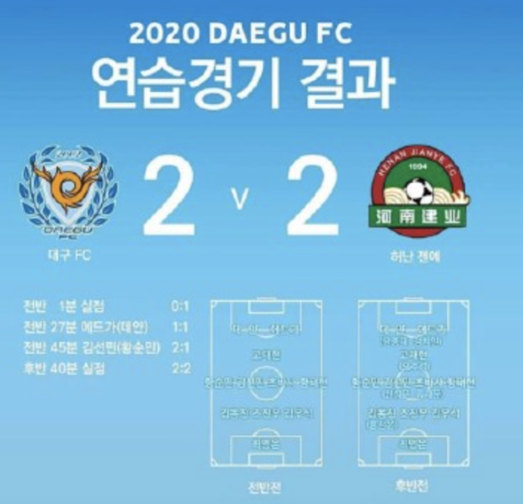 今年一月,大邱FC曾来到中国云南集训,这已是该队连续第五年选择在这里进行冬训。在昆明集训期间,大邱FC与中超多支球队进行了热身赛,其中包括河南建业队。