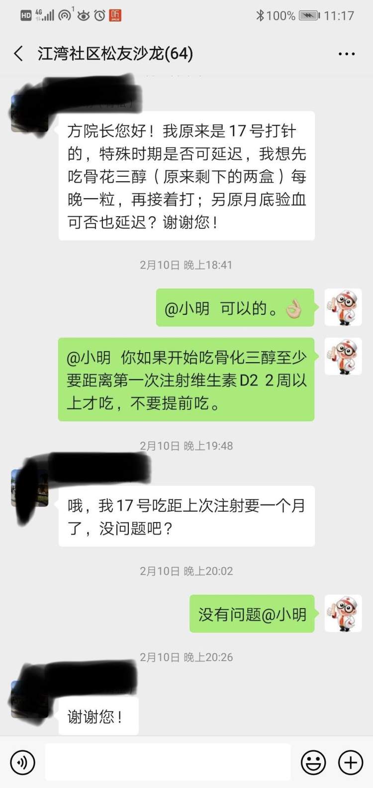 由于受到疫情影响,设在江湾镇街道各市民驿站内的独具江湾特色的“江湾社区骨健康监测咨询服务点”目前暂停服务。但街道社区卫生服务中心副主任方圆,每天都会在“江湾社区松友沙龙”微信群内发布“骨质疏松专病门诊”开诊时间等信息以避免居民空跑,并在线开展化验报告结果咨询、提醒用药注意事项、发布健康保健知识等。