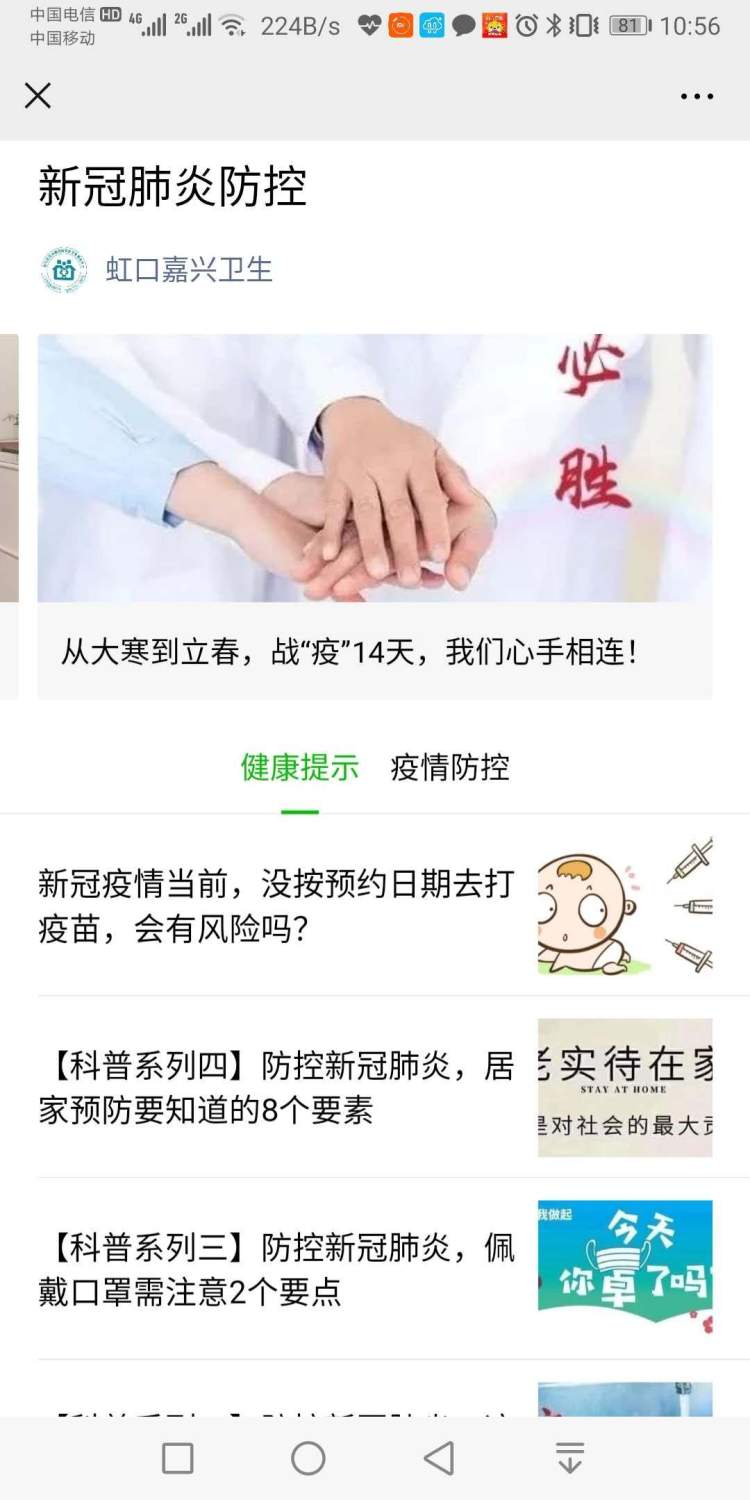 与此同时,街道社区卫生服务中心的微信公众号特别增加了“新冠疫情信息”菜单,以方便居民实时查询有关新冠肺炎疫情的官方权威信息。