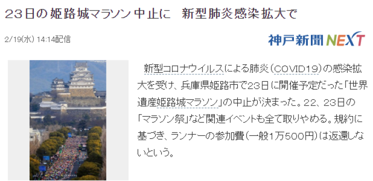19日,日本兵库县姬路市宣布取消原定于23日在该市举办的“世界遗产姬路城马拉松”。