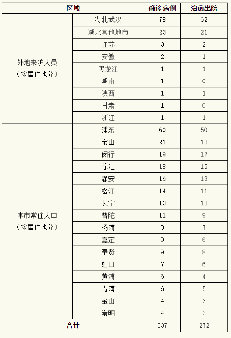 截至2月26日24时,上海市已累计排除疑似病例2285例,发现确诊病例337例。确诊病例中,男性175例,女性162例;年龄最大88岁,最小7月龄;144例有湖北居住或旅行史,34例有湖北以外地区居住或旅行史,158例有相关病例接触史,1例流行病学调查正在进行中;外地来沪人员111例,本市常住人口226例。具体情况如下: