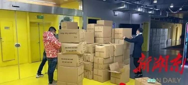 志愿者们连夜搬运口罩等医疗物资 。
