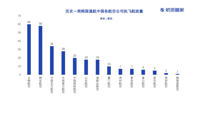 据航班管家数据,2月19日至25日这一周内,韩国通航中国各航空公司执飞航班量排行中,位居前三的依次为大韩航空、韩亚航空和中国东方航空。其中,中国东方航空共执飞34架次。