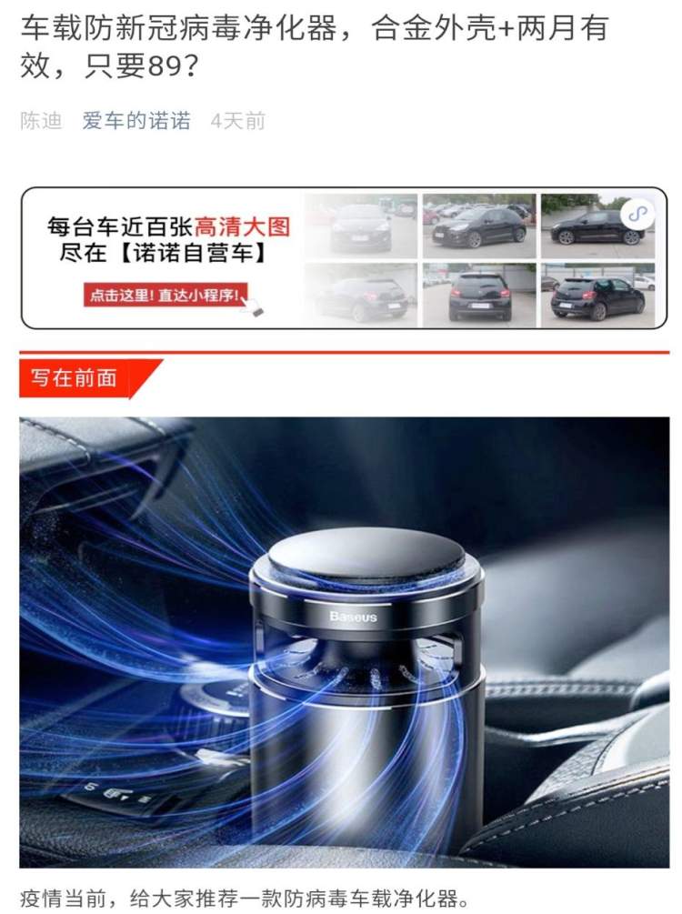 当事人在其企业公众号"爱车的诺诺"中发布含有“防新冠病毒净化器,合金外壳+可换内芯+抗病毒,只要89?”等内容的广告,涉嫌违反《中华人民共和国广告法》相关规定。上海市市场监管局执法总队对当事人开展立案调查。