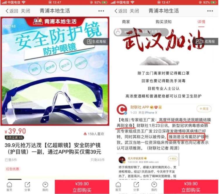 当事人在其微信公众号中新增“消毒杀菌”栏目,其中在销售“39.9元抢万达茂【亿超眼镜】安全防护镜(护目镜)一副,通过APP购买仅需39元”这一商品时使用了国家卫健委专家组成员同时也是新型冠状病毒感染肺炎的患者王广发的言论,涉嫌将普通安全防护镜混淆为医用护目镜;在其他消毒产品中宣称“抗冠除菌必备消毒神器”、“易克妥消毒杀菌喷雾”等,涉嫌违反《中华人民共和国广告法》相关规定。青浦区市场监管局于已对当事人立案调查。