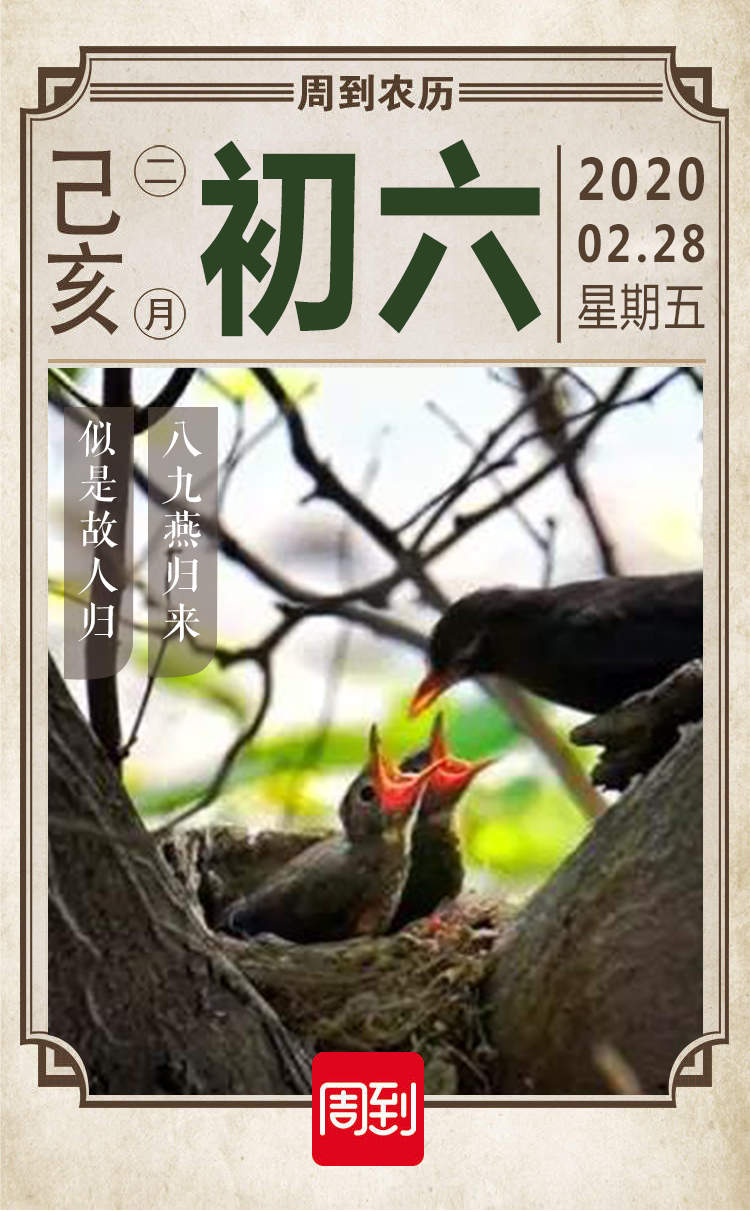 农历中国 | 二月初六 · 八九燕归来 额是狼 2020-2-28 来源:周到上海 八九燕归来 似是故人归 旧时民谣唱到: 桃花红,梨花白, 黄莺鸣叫燕归来。 讲的就是雨水时节与惊蛰前, 春回大地, 南下过冬的燕子, 迎春如约归来, 衔枝筑窝。 这时,农村的老人都知道, 会阻止家中的熊孩子爬树上房顶, 就是怕惊扰了刚刚归来的燕子。 来源:周到上海 作者:额是狼 赞一个 (0)