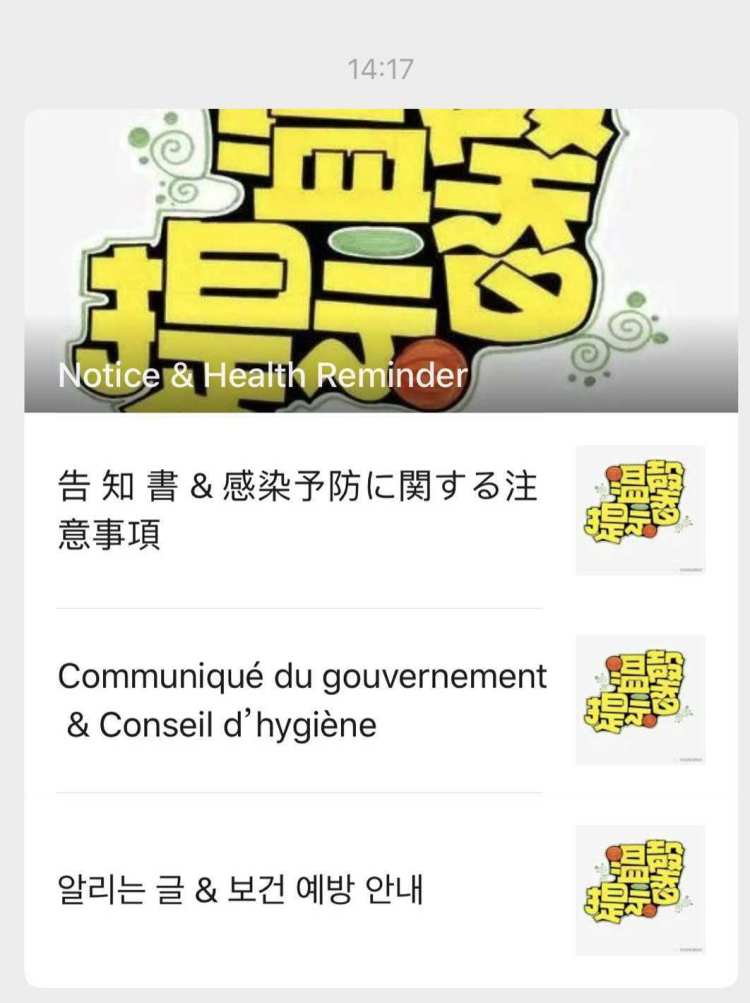 今年尤其如此。农历新年期间,金韵和她的伙伴们都忙着在自己的朋友圈,在居民的微信群里转发关于“新冠”疫情的信息,科普预防提示。唯一不同的是,这里使用的语言可能是韩语、也可能是英语或者日语。