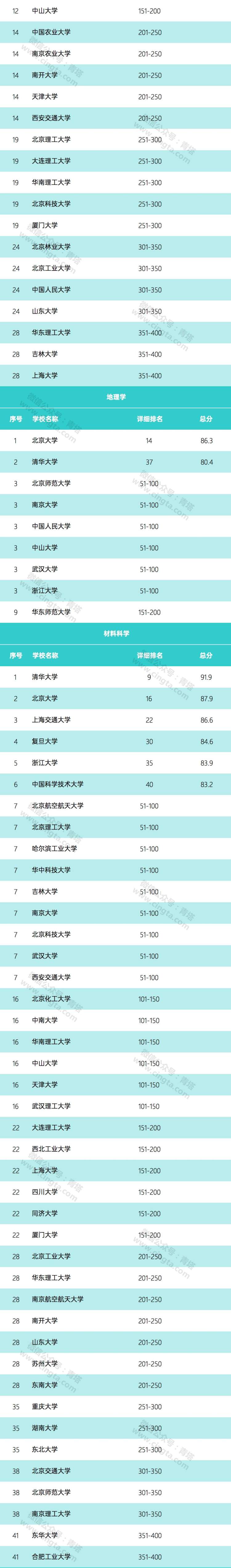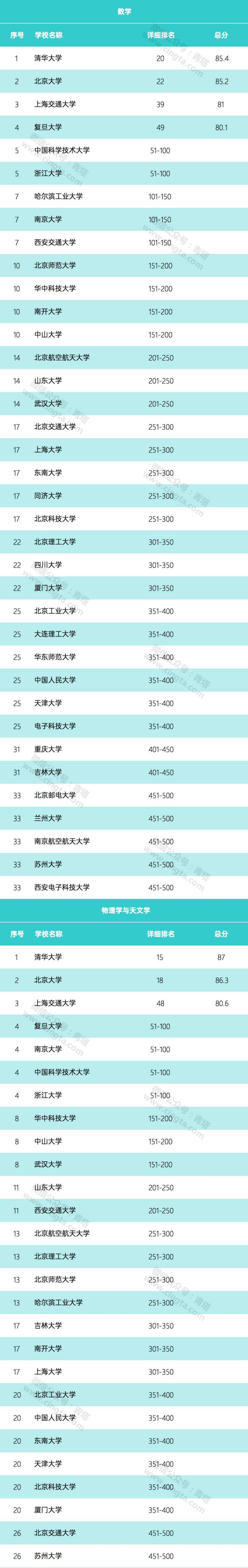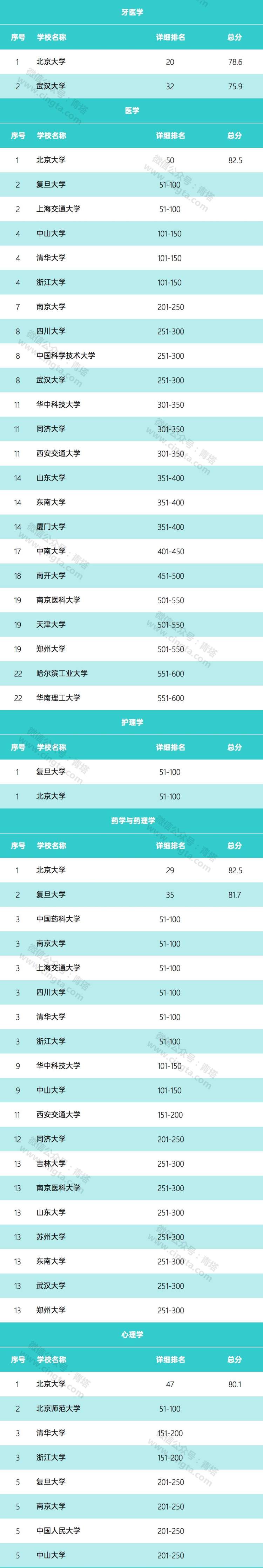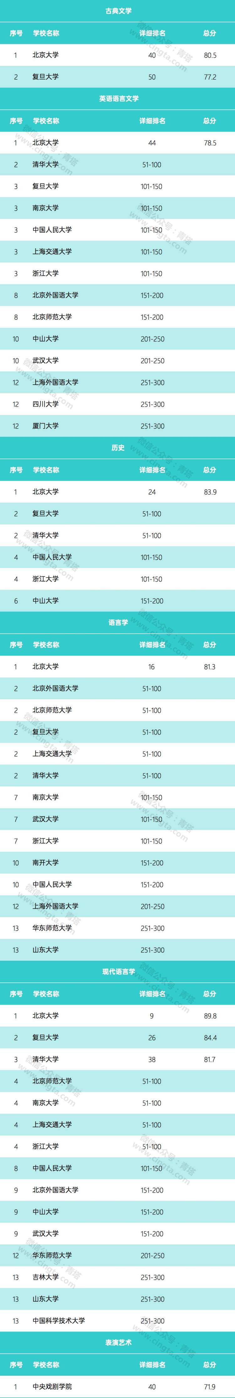 中国大内地共有100个学科进入世界50强,其中北京大学和清华大学分别有32个和22个优势学科,上海交通大学、复旦大学也分别有12个和11个学科上榜。浙江大学、武汉大学、同济大学、南京大学、中国科学技术大学亦有学科跻身世界前50。