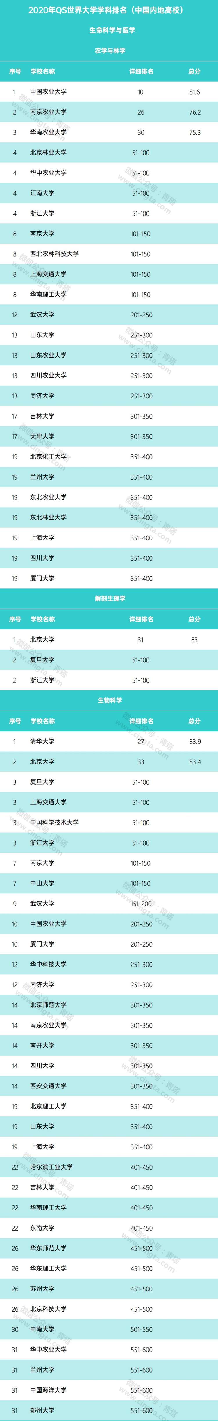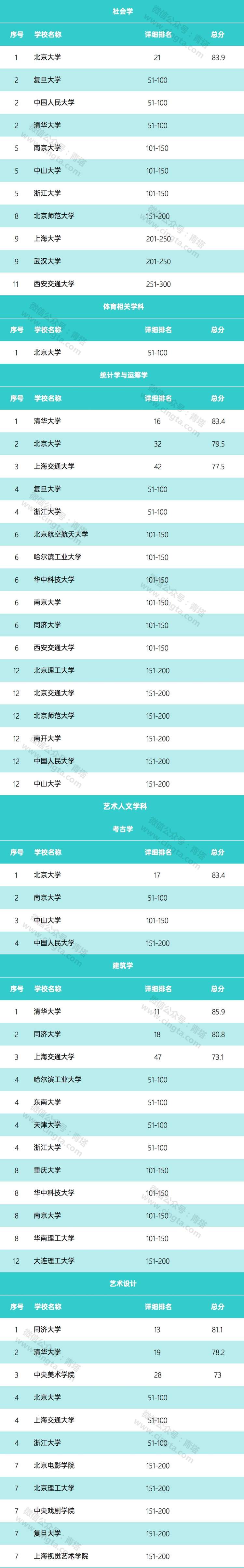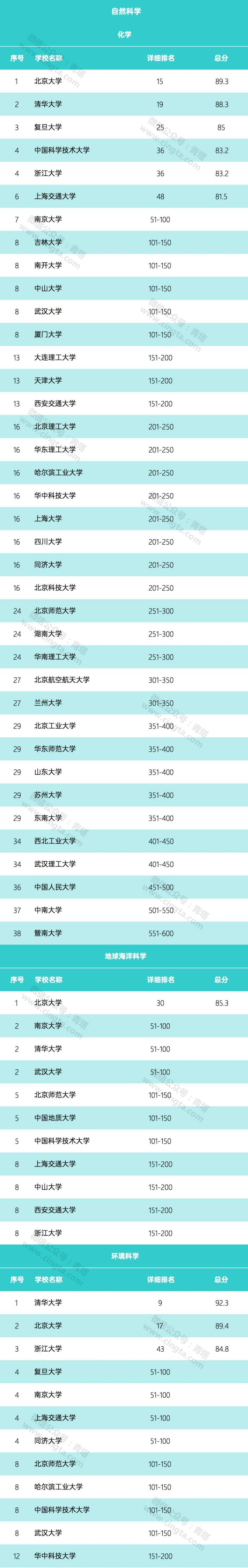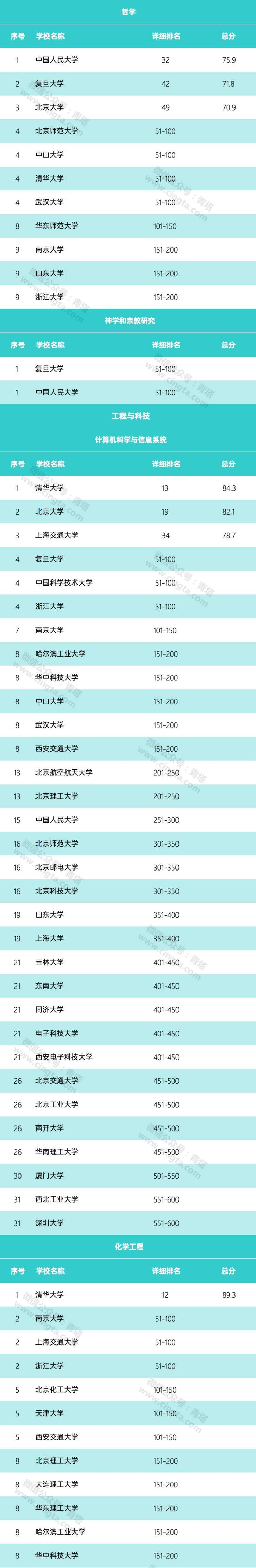 中国大内地共有100个学科进入世界50强,其中北京大学和清华大学分别有32个和22个优势学科,上海交通大学、复旦大学也分别有12个和11个学科上榜。浙江大学、武汉大学、同济大学、南京大学、中国科学技术大学亦有学科跻身世界前50。