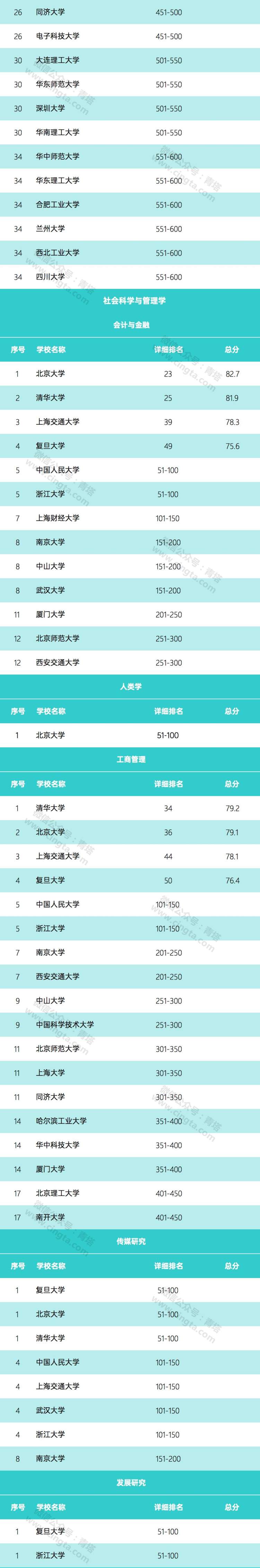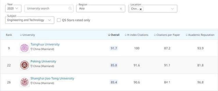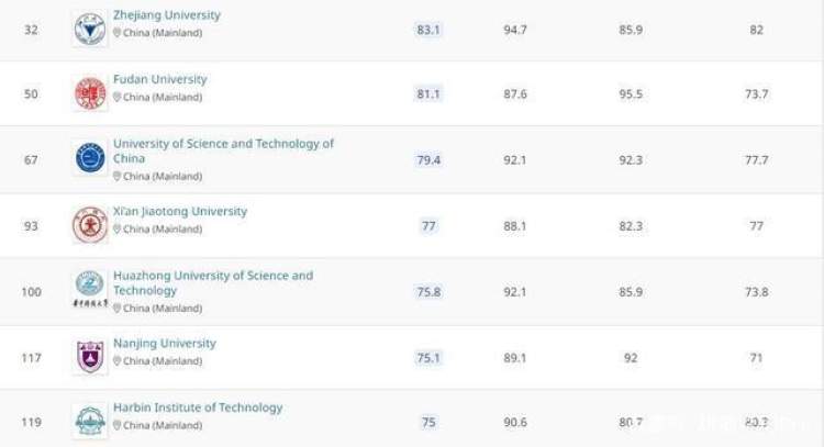 同样进入前 100 榜单的中国高校还包括:香港中文大学、上海交通大学、香港大学、香港城市大学、复旦大学、台湾大学、香港理工大学、中国科学技术大学和浙江大学。