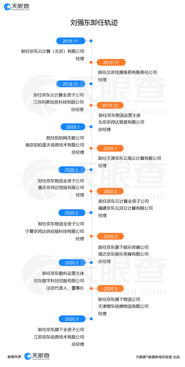 天眼查数据显示,此次高管变动,已是刘强东2020年以来卸任的第9家公司。近期,刘强东还卸任了京东数科运营主体京东数字科技控股有限公司的法定代表人和董事长,此外,还包括京东物流全资子公司、京东云计算全资子公司等运营主体的高管职位。