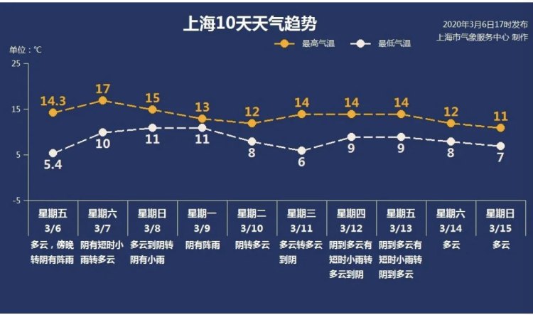 明天再接再厉,申城的最高气温也冲出一个小高峰来,最高气温可达17℃,最低气温也攀升显著,可以达到10℃附近。