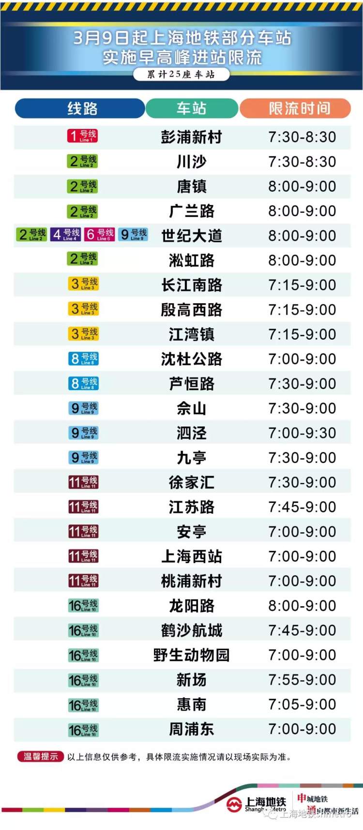 据预测,下周上海地铁客流仍持续回升。从3月9日下周一起,运营方除对现有17座车站实施限流,还将至少增加1号线彭浦新村站、2号线川沙站、淞虹路站、8号线芦恒路站、11号线徐家汇站、安亭站、上海西站站、桃浦新村站限流,全路网总计至少25座车站实施早高峰限流。