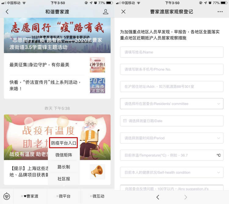 根据街道的防控要求,所有返沪人员需要在街道官微平台上登记返沪信息。隔离期间,隔离人员每天登录平台上报身体状况,居委会干部从后台能实时跟踪返沪人员信息。在居委会的督促下,各小区物业公司也各司其职,同时做好返沪人员登记和信息报备工作。