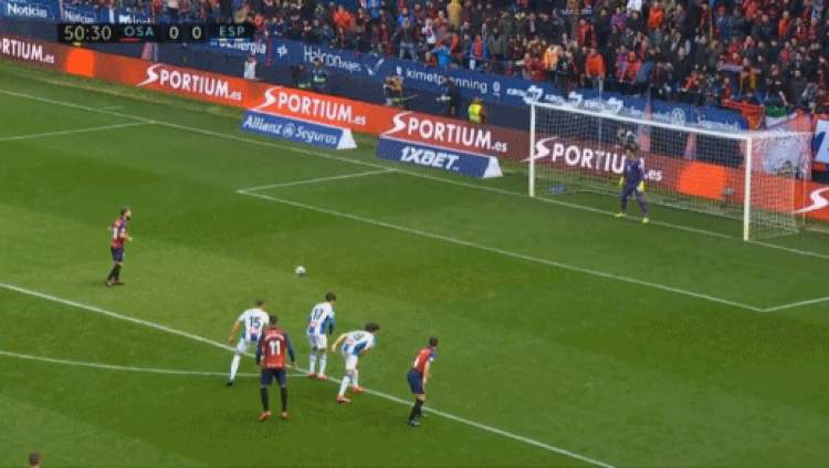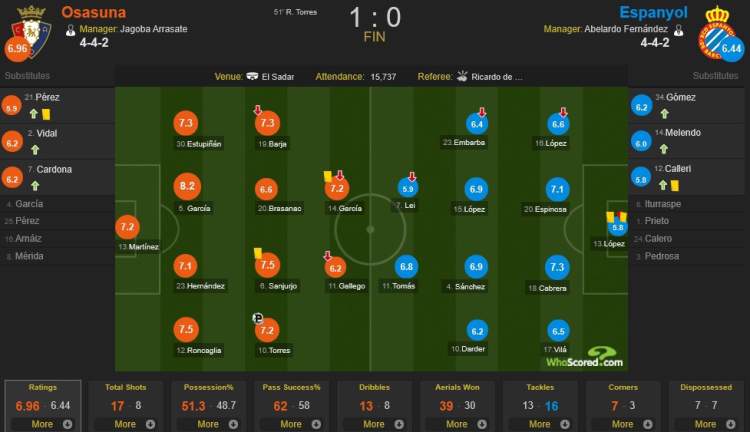 第51分钟,维克托·桑切斯禁区内手球犯规,主裁判果断吹罚点球,奥萨苏纳中场罗伯托·托雷斯采用勺子点球的方式攻破了西班牙人的大门。