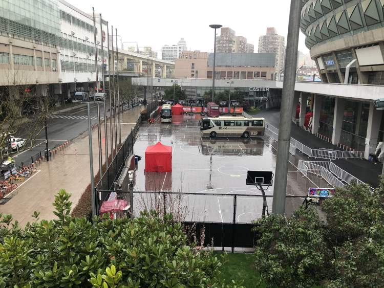 今天一早,细雨之下,虹口足球场显得格外安静。交接点由两个篮球场组成,面积超过1000余平方米,整体显得十分宽敞空旷。场内有几个红色的帐篷,外面有着密密的护栏,隔开了普通路人。两辆核载50人的大巴耐心地停靠在内,车门上均贴着“本车已消毒”的字样。车上,司机庄师傅戴着口罩坐在位子上,车窗边挂着几件隔离服,随时待命着。