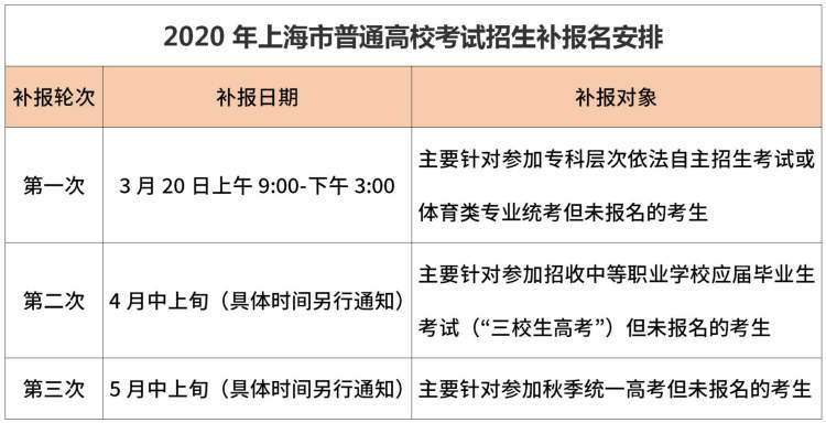 市教育考试院表示,第一次2020年高考报名工作已于2019年12月基本结束。考虑到可能有个别考生因各种原因错过前期考试招生报名,本着以考生为本的原则,2020年上海市普通高校考试招生将安排三次补报名。