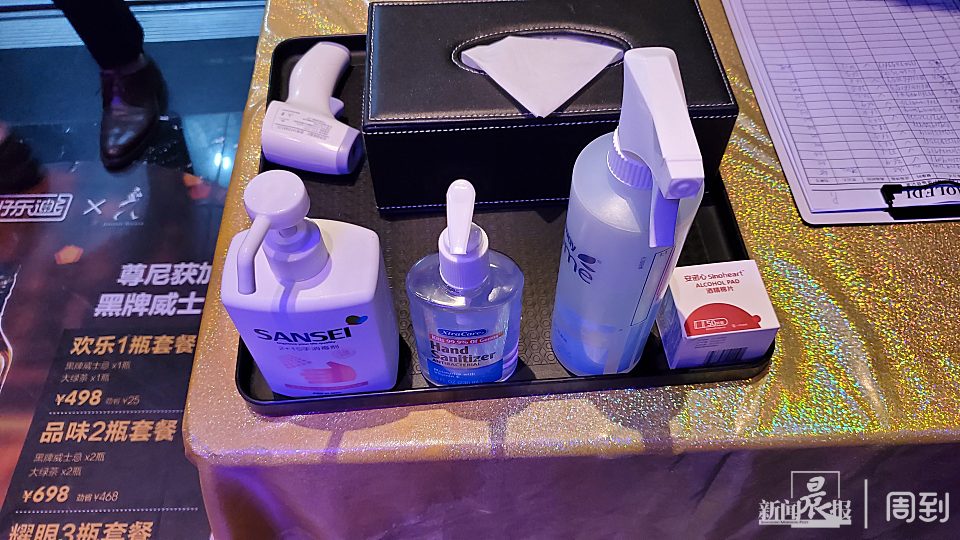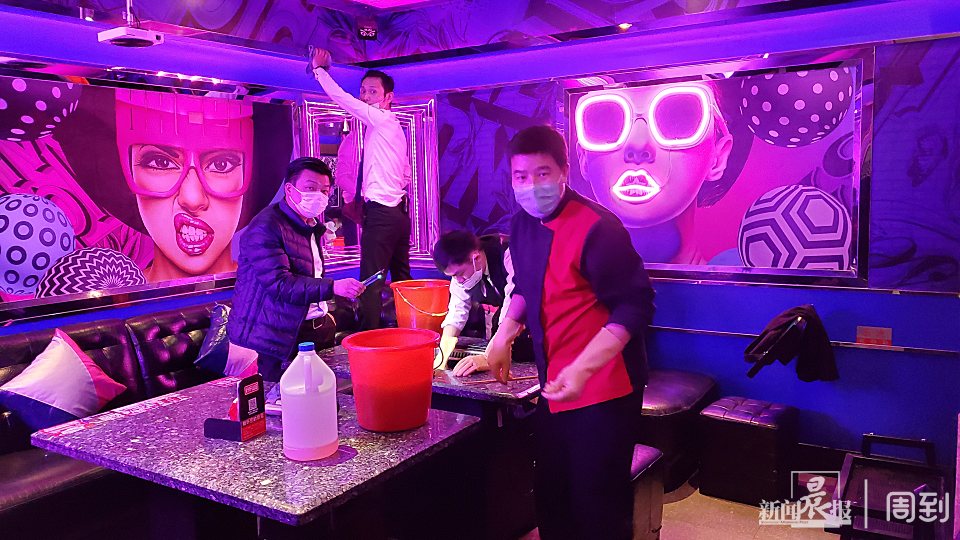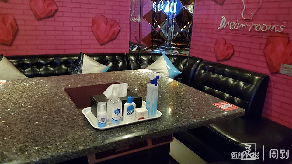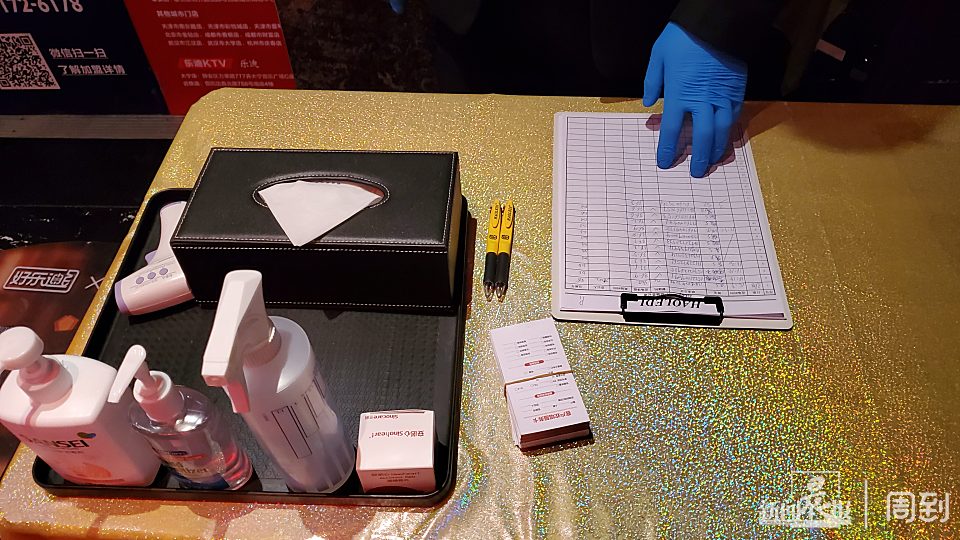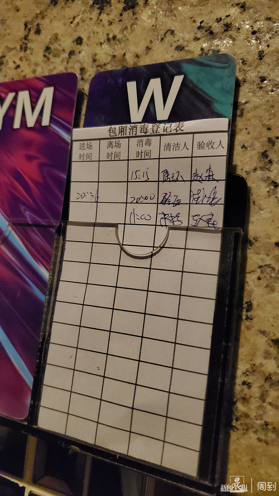 工作人员表示,所有包厢每天消毒8次,每间包房门口插着包厢消毒登记表,上面要登记客人的进场时间、离场时间、工作人员的清洁时间、清洁人和验收人的名字。每批客人离开后,都会有专人进行专场消毒。