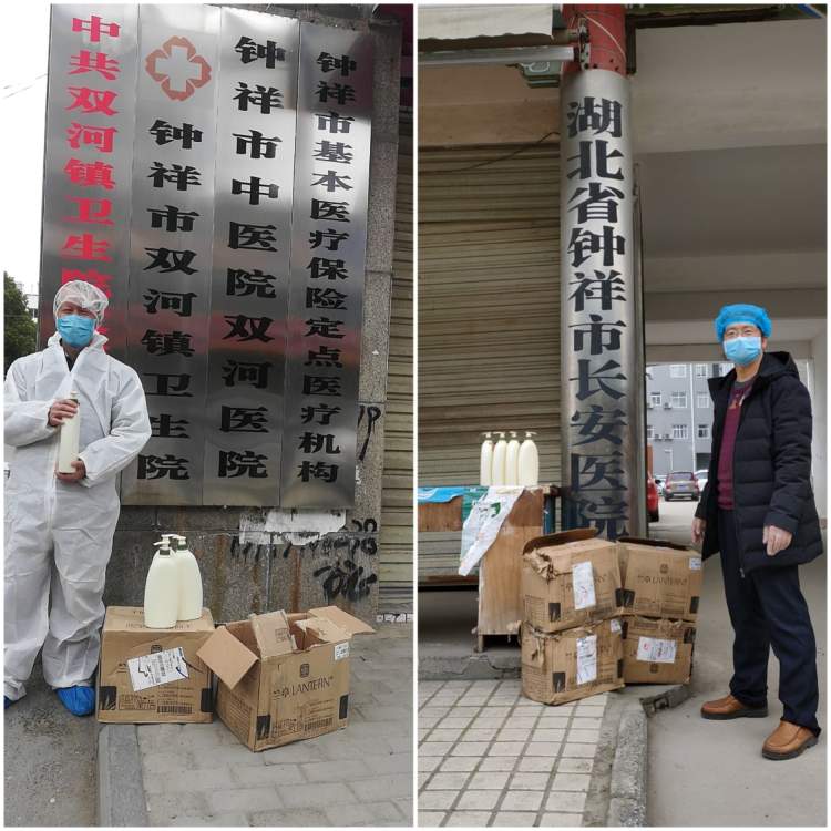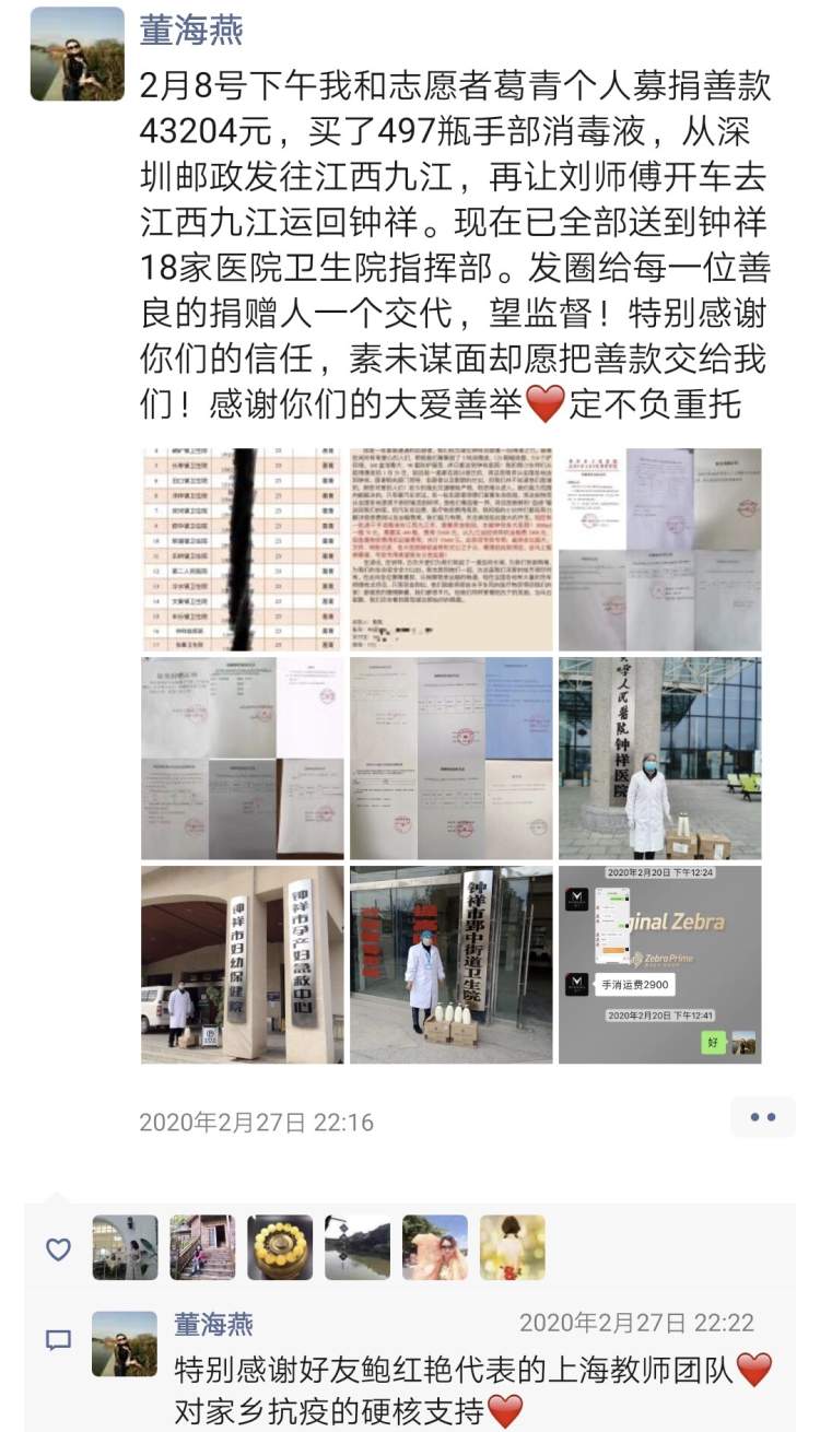 鲍红艳有一位朋友,是钟祥市志愿者,对接捐赠免洗消毒液缺两万资金。得知这个消息,她第一时间发动同事、同学、朋友募捐,得到了大家的积极响应,很快就募捐到两万余元,购买手部消毒液,对捐给湖北钟祥市18家乡镇医院。在得知疫情越来越严重,家乡的医院一个防护镜要几个医生轮流用的时候,防护服、口罩、消毒液等物质严重储备不足的时候,通过各种渠道一共募集口罩2000余个,160个防护镜和90套防护服,第一时间发回家乡。