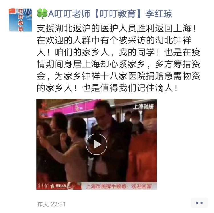 鲍红艳同事很多老家湖北的,有位同事年前回去路上堵车花了3天,到家后赶上疫情,就在家待了2天,年三十就赶回来,在家自我隔离。原本自己也买了高铁票初二回家,没想到疫情暴发,武汉封城,回不去了,春节虽然没回家,但她一刻也没闲着。鲍红艳的家乡湖北荆门钟祥市,是这次疫情的严重地区,身在上海的她每天看新闻,关注家乡疫情发展,非常担心湖北家人和朋友们,内心很煎熬,晚上失眠。看到很多朋友在武汉抗击疫情一线,觉得自己作为湖北人,家乡有难,自己要行动起来。