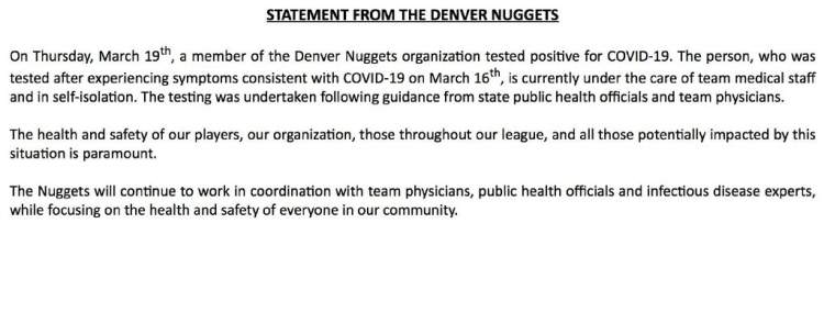 掘金方面队内人员出现1例确诊,但据跟队记者透露,除非掘金球员出现症状,否则掘金不打算给球员进行检测。