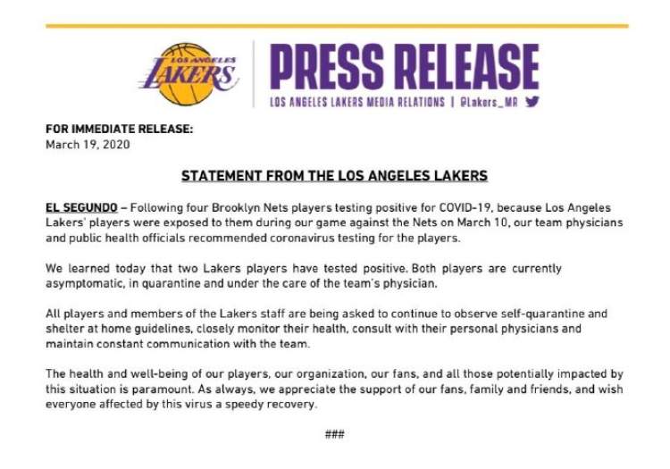 洛杉矶湖人队官方也发表了声明,表示两名确诊球员目前都尚无症状,正在进行隔离并接受队医观察。此外,据美国媒体报道,湖人现在计划对一部分和球员接触密切的教练和职员进行新冠病毒检测。