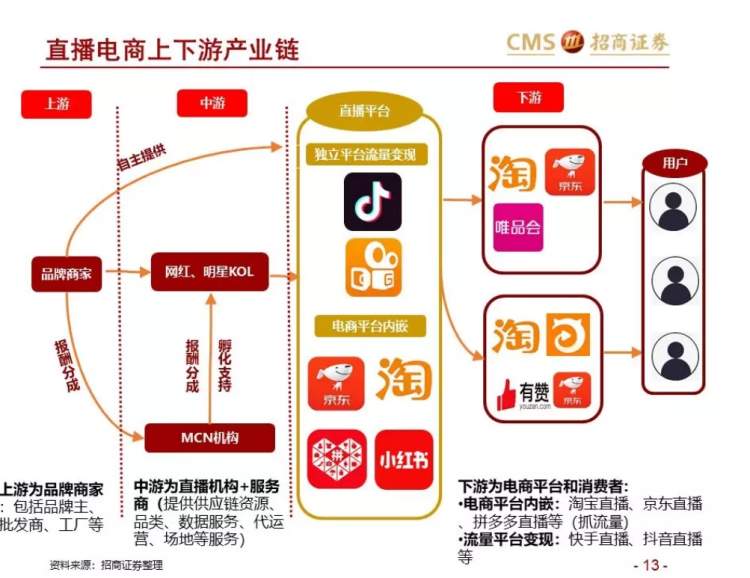 根据对产业链上下游及互联网巨头分析,招商证券认为,直播电商作为电商代运营的一种方式,平台最先受益。其次,由于产业链上下游分散且充分竞争,具有供应链优势、规模人设打造的MCN或将胜出。MCN机构中,具有供应链能力及孵化网红的头部机构例如如涵、谦寻等,但目前体量均较小,商业模型及盈利能力还有待验证。