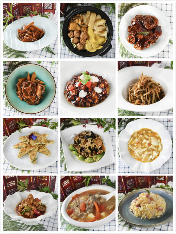 中式热菜包括:虾籽油焖笋、三鲜汤、百叶结红烧肉、萝卜牛尾、八宝辣酱、咸菜笋丝炒肉丝、香椿头跑蛋、素什锦、蟹粉豆腐、香辣牛蛙、番茄土豆牛腩汤、宝和炒饭。