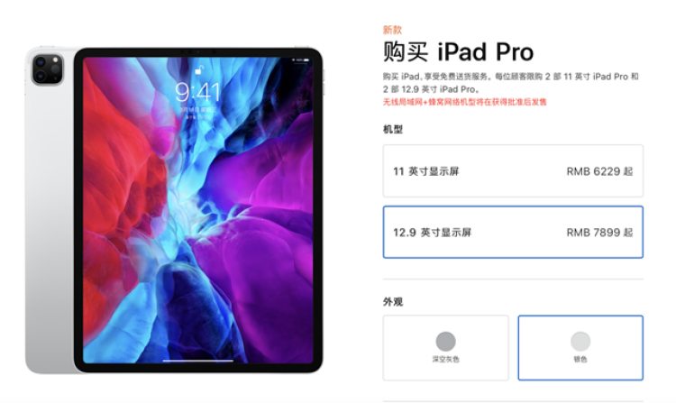 2020新款iPad Pro拥有11寸和12.9寸两个版本,机型有WiFi版、WiFi+蜂窝网络版两种,仍是银河和深空灰两种配色。