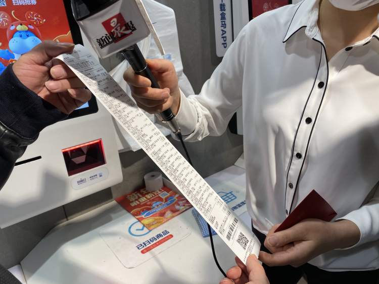 侯毅在自助结账机前扫起了码,留下一条长长的购物小票。