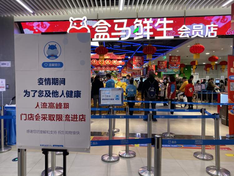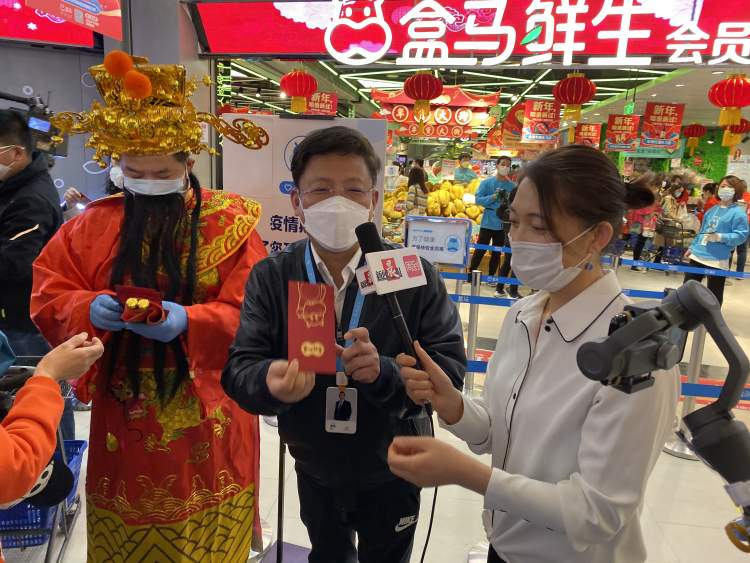 可以看到,为了营造过年气愤,盒马店内布置地红红火火。
