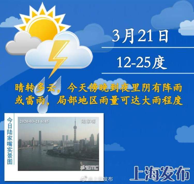 今天早晨开始西南暖湿气流活跃北抬,申城云系逐渐增多,傍晚起转为阴有阵雨或雷雨的天气。主要降水时段出现在今天夜间,过程雨量可达20~40毫米,小时最大雨强20~30毫米,期间可伴有雷电和7~9级雷雨大风(局地可能出现小冰雹)。气温方面今天最高可达25℃。周日雨止转为阴转多云,气温会有小幅度回落,周日全天在15~20℃。从目前的最新资料来看,下周天气与本周大相径庭,连绵不断的阴雨天将登上舞台唱主角。气温方面,下周气温先升后降,周中最高气温将再次升至“2”字头。总而言之,下周将是春雨绵绵的一周。