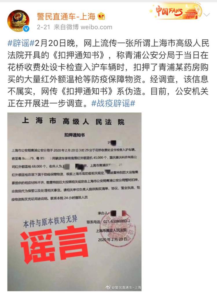 俞澜昇说,2月20日流传的“上海市高级人民法院扣押通知书”,称青浦警方在花桥收费站扣押防疫物资。从文书格式、表述方式等方面,警方一眼就辨识出这是伪造的法律文书。