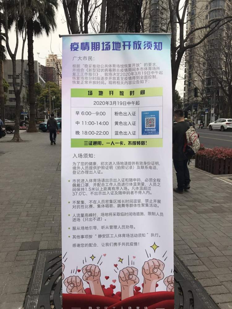 在静安区工人体育场,目前分早上(6:00-9:00)、中午(11:00-14:00)、晚上(18:22:00)三个时间段开放,只要出示随申码,并凭有效证件即可进入健身。