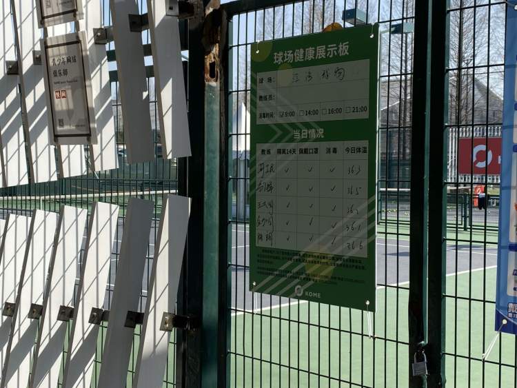 唯一不同的是球场在门口有一块健康展示板,将当日教练的隔离天数、佩戴口罩、今日体温等写在上面,一目了然。
