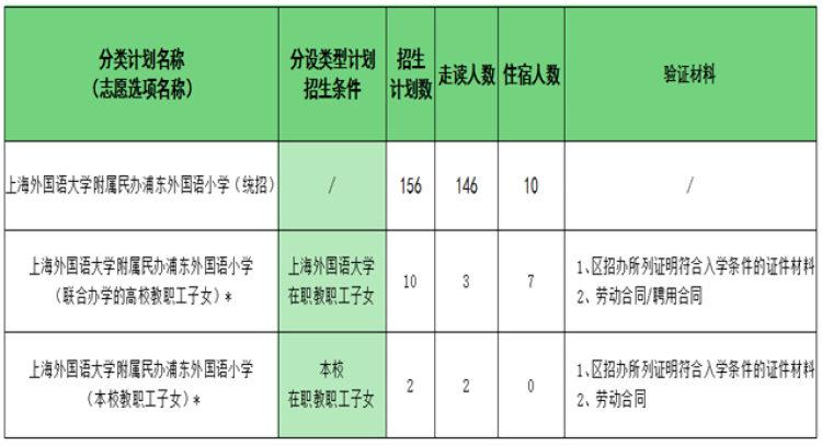 上海外国语大学附属民办浦东外国语小学2 0 2 0 年将统招156人,分设计划包括上外在职教职工子女、浦外小学本校在职教职工子女,总共12人。