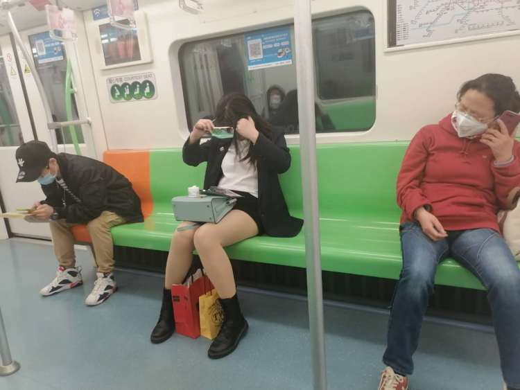 一位女乘客,走进地铁车厢入座后,不仅没有扫码登记,还将口罩摘下, 悠闲地看起了手机。周到记者昨天下午在地铁12号线目睹这一幕。