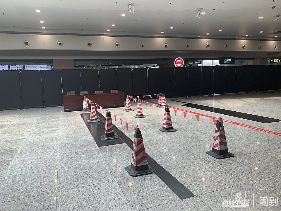 记者注意到,在五洲南路区域,原先旅客可以任意通行的用餐区域,已经被黑色挡板围了起来,并有安保负责看守。一位安保告诉记者,这是最近几天新扩出来的区域,一块用作工作人员取餐,一块用作旅客急救。