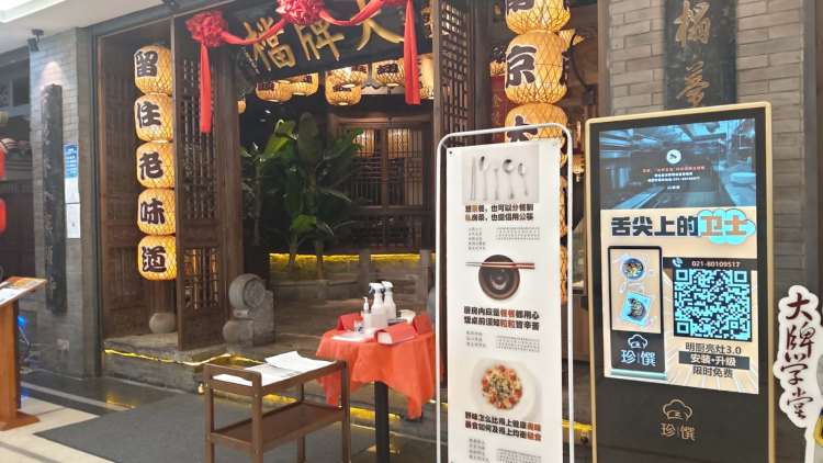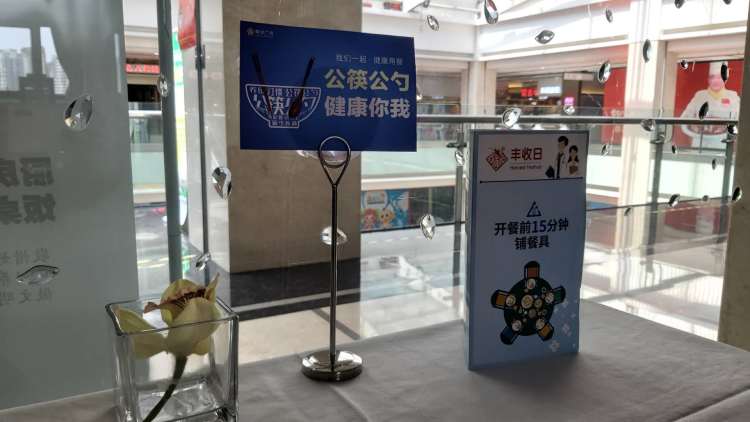 今天在联洋广场里,周到君看到几乎每家餐厅没有都摆着倡导分餐和使用公筷的宣传牌。