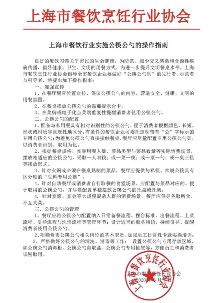 近日,上海市餐饮烹饪协会发布了《上海市餐饮行业实施公筷公勺的操作指南》。