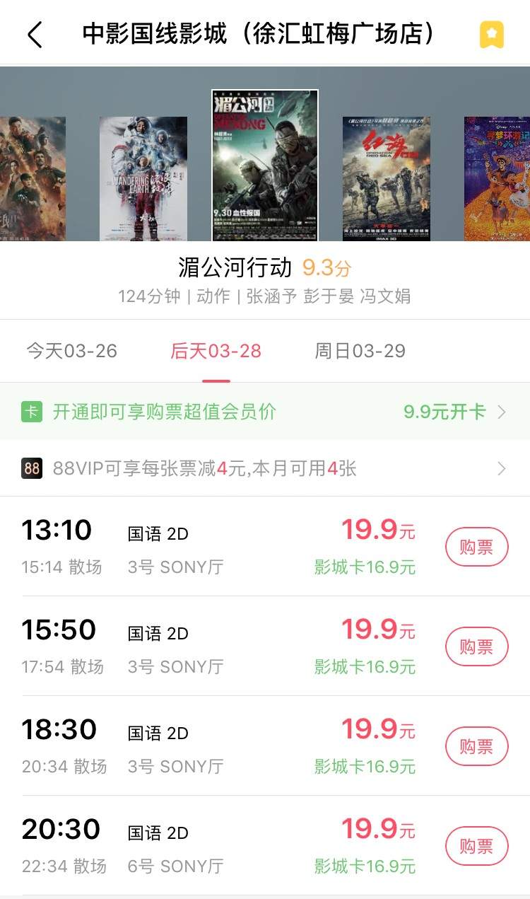 比如中影国线影城(徐汇虹梅广场店),在淘票票购票页面上显示,目前排映的影片又《战狼2》《流浪地球》《湄公河行动》《红海行动》《寻梦环游记》这五部影片,电影票售价均在20元左右,相比以往的价格便宜了至少一半以上。