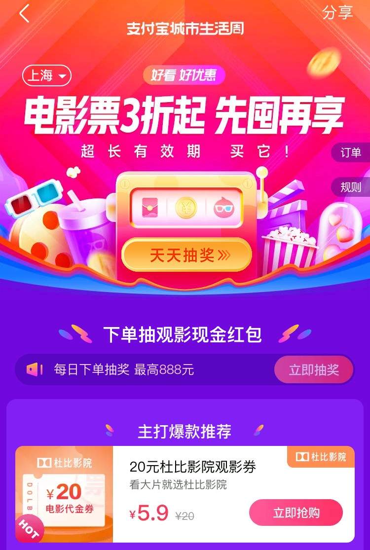 比如淘票票上线了“上海市电影观影惠民月”活动:“3月28日至4月26日,每天10点开抢电影票,限量2万张,每张票价立减10元,若原票价低于10元,只用付1元即可。”