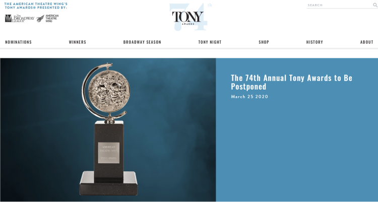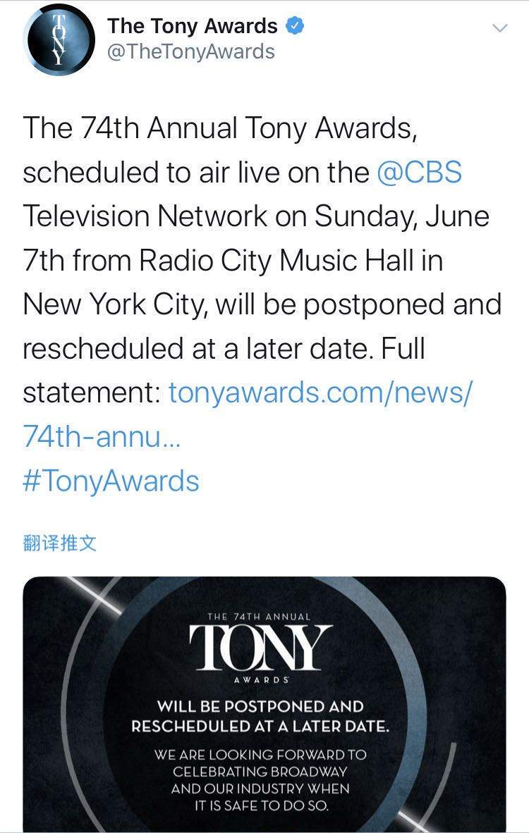 今年第74届托尼奖原定4月23日报名截止、4月28日宣布提名、6月7日颁奖。