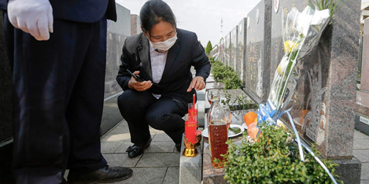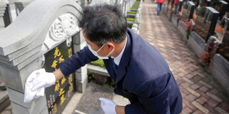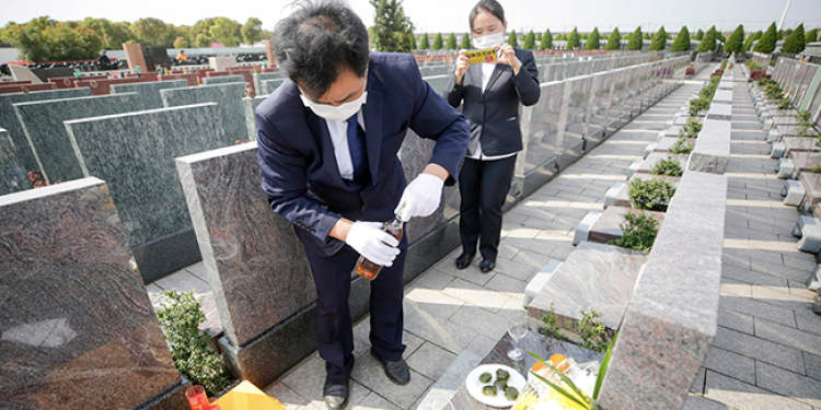 鲜红的苹果,金黄的橘子,碧绿的青团一一罗列,一把带着水珠的鲜花斜斜地依在墓碑前。随后,礼仪公司的工作人员打开电子香烛,用洁白的毛巾把墓碑以及大理石墓盖仔细地擦拭,再拧开一瓶老酒,倒在两只高脚的玻璃杯里,对着墓碑三鞠躬。与此同时,一名工作人员用手机全程拍摄视频和图片。这些视频和图片将发送给下单的顾客,待对方确认后,完成支付,交易结束。