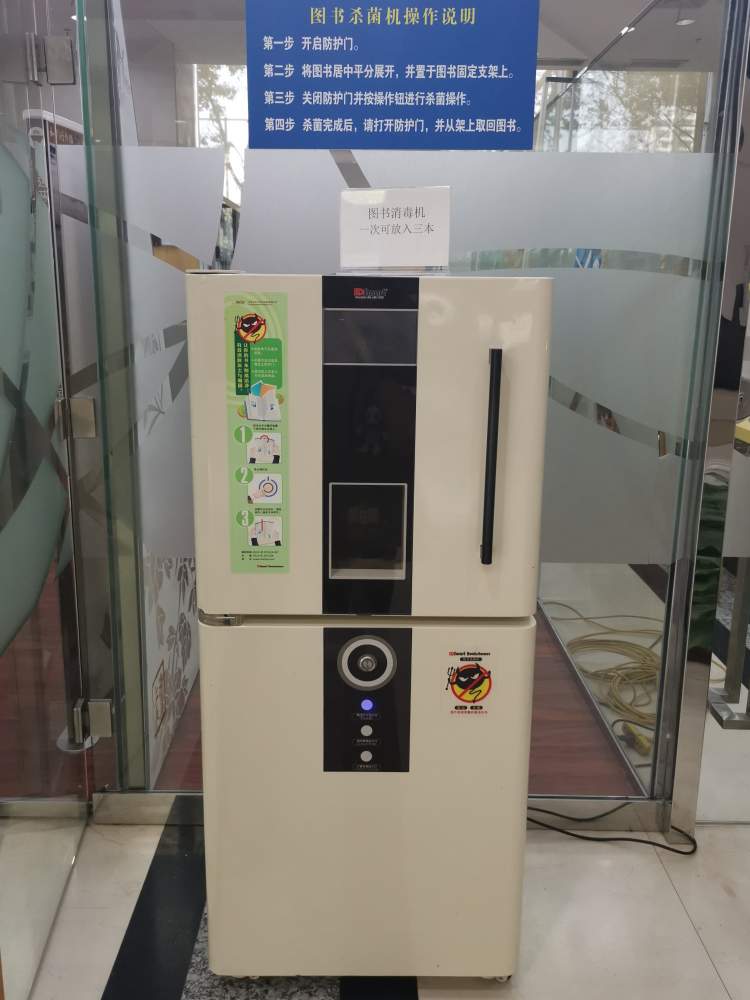 据相关负责人介绍,“还回来的图书第一时间被送进了消毒房,经过图书消毒机、紫外线消毒灯等环节消毒后方可上架。”“疫情期间综合外借室”入口处还安置了一台图书杀菌机,读者可以自主选择是否需要对已借图书再次消毒。图书杀菌机一次最多可消毒3本书。