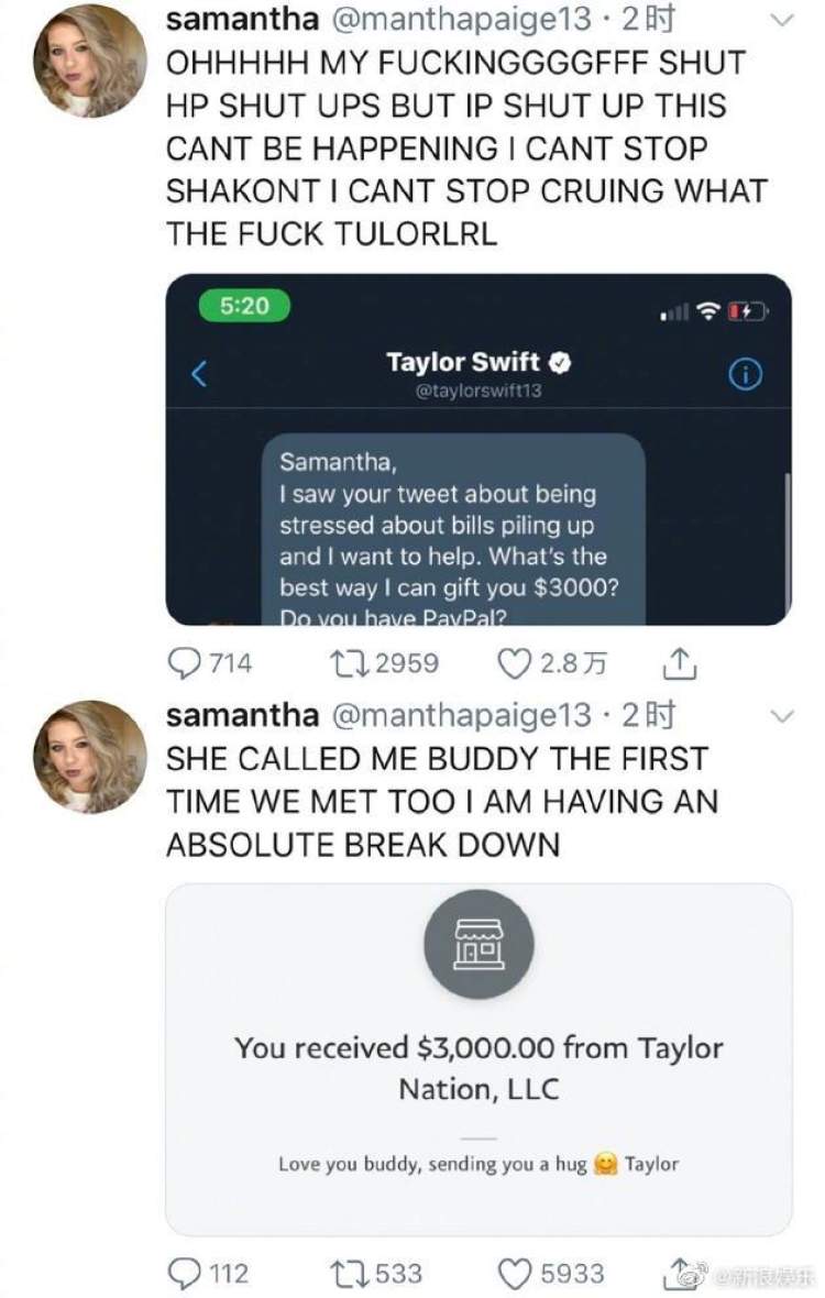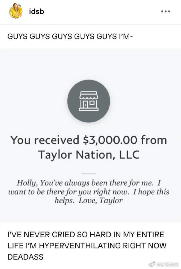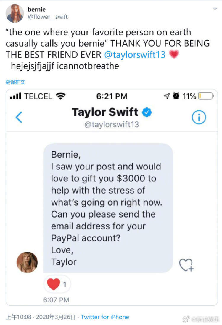 大写的赞!霉霉向多位受疫情影响粉丝捐款,每人3000美元 徐宁 2020-3-26 来源:周到上海 近日,“霉霉”泰勒·斯威夫特(Taylor Swift)连续向多位因新冠肺炎疫情影响生活工作,陷入经济困境的粉丝捐助了3000美元。 受新冠肺炎疫情影响,一些粉丝发文称在经济上出现困难,霉霉得知后主动私信,向多位陷入经济困境的粉丝每人捐助了3000美元,她还给其中一位粉丝留言道:“Holly,你一直陪伴在我身边,现在到我来支持你了,希望能帮到你。” 温暖! 网友评论:大写的人美心善! 来源:周到上海 作者:徐宁 赞一个 (0)