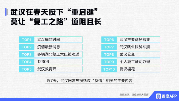 武汉在春天按下了“重启键”,生活逐步回归正轨。报告显示,近7天,“武汉解封时间”、“12306”、“武汉主要商场营业”、“个人复工证明办理”等,与出行、复工相关内容被武汉网友热搜热议。值得注意的是,“多辆湖北复工大巴被劝返”的热度居高不下,在武汉即将解封之际,莫让“劝返”煞了春天复苏的风景。