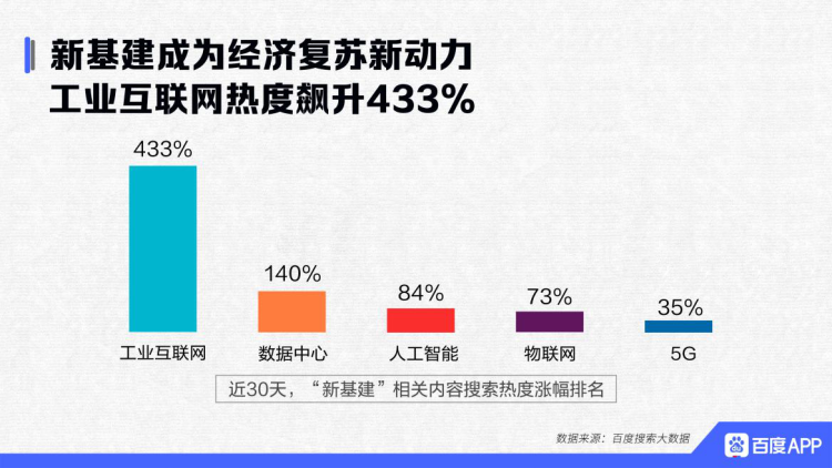 国内疫情好转,人们开始更多关注经济情况。3月4日,中共中央政治局常务委员会召开会议,强调要加快5G网络、数据中心等新型基础设施建设进度,新基建成为经济发展的热点话题。报告显示,“新基建”相关内容的搜索热度近来均出现明显上升。近30天,工业互联网搜索热度环比涨幅达433%,数据中心环比涨幅达140%。